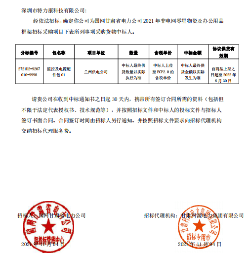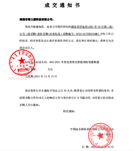 特力康中標國網黑龍江送變電工程公司的2024年度第18次物資類競爭性談判采購項目——慶陽驅鳥器物資框 特力康中標國網甘肅省電力公司省管產業單位2024年第五次物資競爭性談判授權采購項目 中標喜訊:深圳市特力康科技有限公司成功入圍許繼集團綜合能源公司輸電線路視頻在線監測裝置模塊集采項目 中標喜訊:特力康成功中標國網重慶市電力公司渝中一片區項目 特力康成功中標國網天津市電力公司2024年第二次?物?資招標項目 特力康中標國網安徽省電力有限公司蕪湖供電公司2024年3月非物質采購項目 浙江電力裝上“氣象哨兵”:特力康裝置守護電網應對臺風暴雨 蜀道巡線不用“爬”:特力康視頻在線監測裝置守護四川輸電鐵塔 風雪中的 “防冰哨兵”:內蒙古電力用特力康監測系統筑牢覆冰防線 雙軸感知護塔穩:山西電力用特力康裝置破解采空區傾斜難題 江西電力裝上 “智能防鳥衛士”—— 特力康綜合激光驅鳥器破解湖區變電站鳥害難題 破解巡檢難題:貴州電力用特力康 AI 微拍裝置,精準捕捉線路隱性隱患 精準捕捉 “微氣象”:浙江電力用特力康預警系統筑牢電網氣候防線 守護 “電力咽喉”:湖南電力投用百套特力康三跨 4G 監控球,筑牢安全防線 貴州電力裝特力康電網架空線路覆冰監測系統,精準防冰保電網過冬? 寧夏配電線路安裝了我司防外破電子化智能警示牌