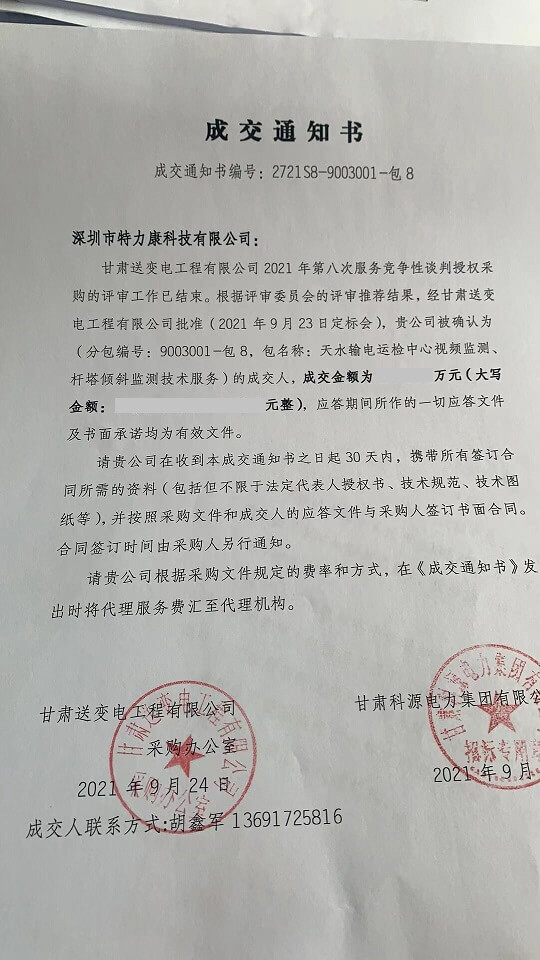 特力康中標國網黑龍江送變電工程公司的2024年度第18次物資類競爭性談判采購項目——慶陽驅鳥器物資框 特力康中標國網甘肅省電力公司省管產業單位2024年第五次物資競爭性談判授權采購項目 中標喜訊:深圳市特力康科技有限公司成功入圍許繼集團綜合能源公司輸電線路視頻在線監測裝置模塊集采項目 中標喜訊:特力康成功中標國網重慶市電力公司渝中一片區項目 特力康成功中標國網天津市電力公司2024年第二次?物?資招標項目 特力康中標國網安徽省電力有限公司蕪湖供電公司2024年3月非物質采購項目 浙江電力裝上“氣象哨兵”:特力康裝置守護電網應對臺風暴雨 蜀道巡線不用“爬”:特力康視頻在線監測裝置守護四川輸電鐵塔 風雪中的 “防冰哨兵”:內蒙古電力用特力康監測系統筑牢覆冰防線 雙軸感知護塔穩:山西電力用特力康裝置破解采空區傾斜難題 江西電力裝上 “智能防鳥衛士”—— 特力康綜合激光驅鳥器破解湖區變電站鳥害難題 破解巡檢難題:貴州電力用特力康 AI 微拍裝置,精準捕捉線路隱性隱患 精準捕捉 “微氣象”:浙江電力用特力康預警系統筑牢電網氣候防線 守護 “電力咽喉”:湖南電力投用百套特力康三跨 4G 監控球,筑牢安全防線 貴州電力裝特力康電網架空線路覆冰監測系統,精準防冰保電網過冬? 寧夏配電線路安裝了我司防外破電子化智能警示牌